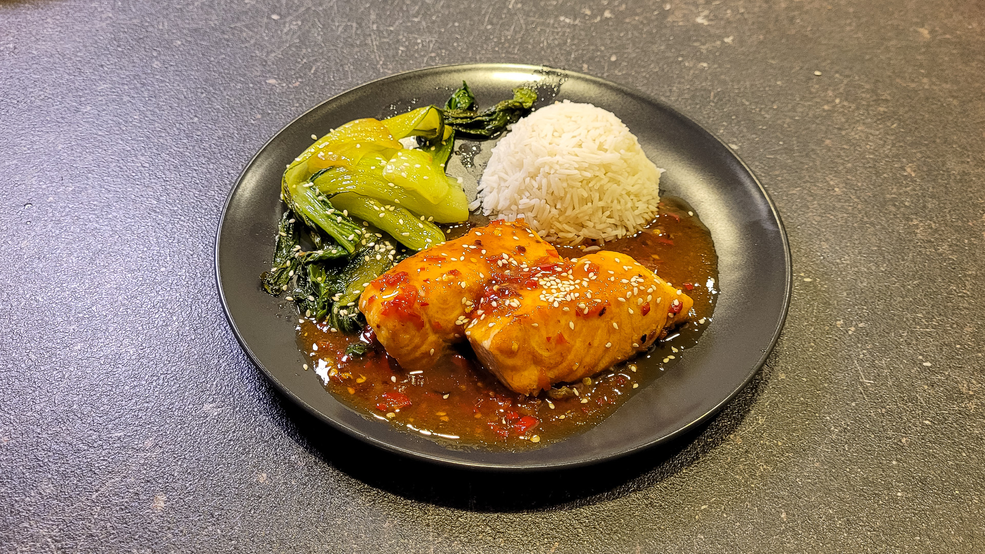 Fileje lososa razrežem na cca 2-3cm debele trake. V ponvi segrejem olje ter lososa položim na stran kože. Pečem par minut, ter ga nato izmenično obračam, da ga popečem iz vseh strani. Cilj je dobiti središčno temperaturo nad 50°C. Ko jo dosežemo lososa prelijem s prej pripravljeno omako. Vse skupaj naj bo v ponvi še cca 1 minuto. V tem času pa omako dobro premešam z lososom, da se okusi povežejo.