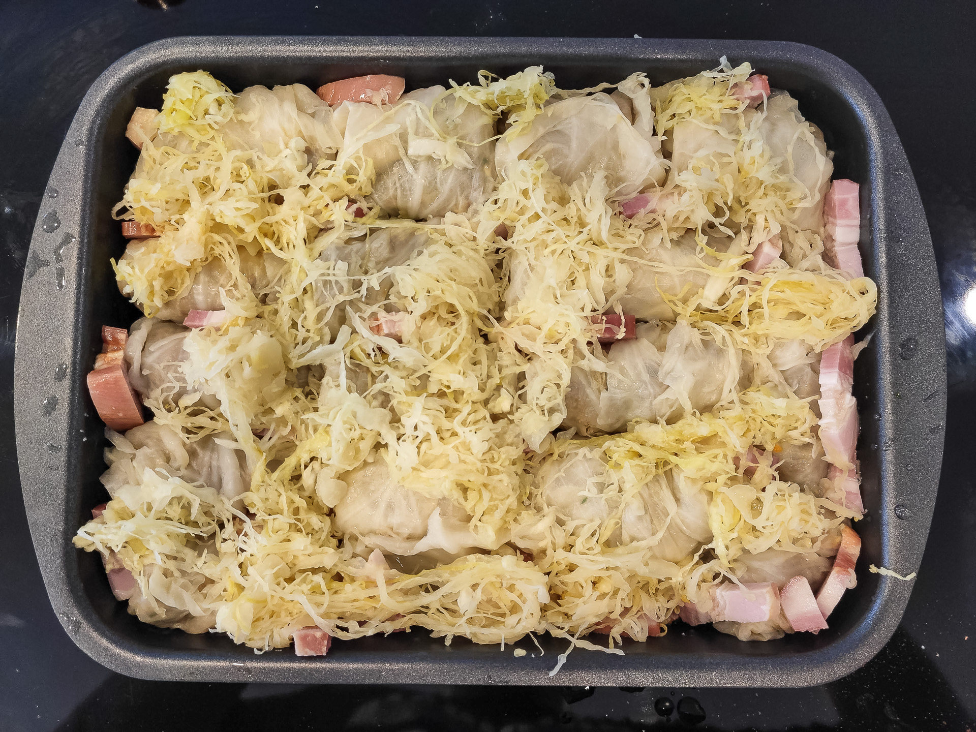 Prekajena rebra narežem na manjše kose in jih dam med sarme. Na vrh dam še malo naribanega kislega zelja in/ali ostankov kisle glave zelja. Vse skupaj zalijem z 2-3dcL vode.