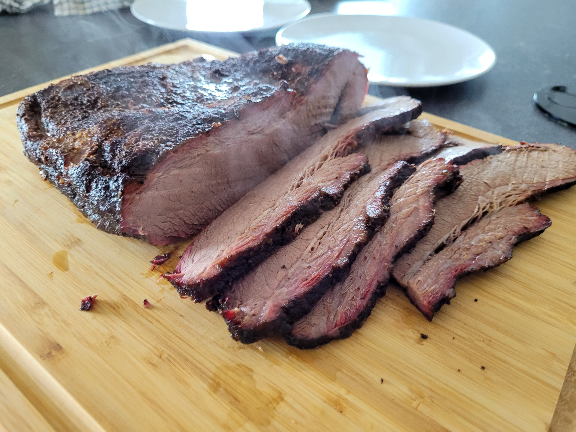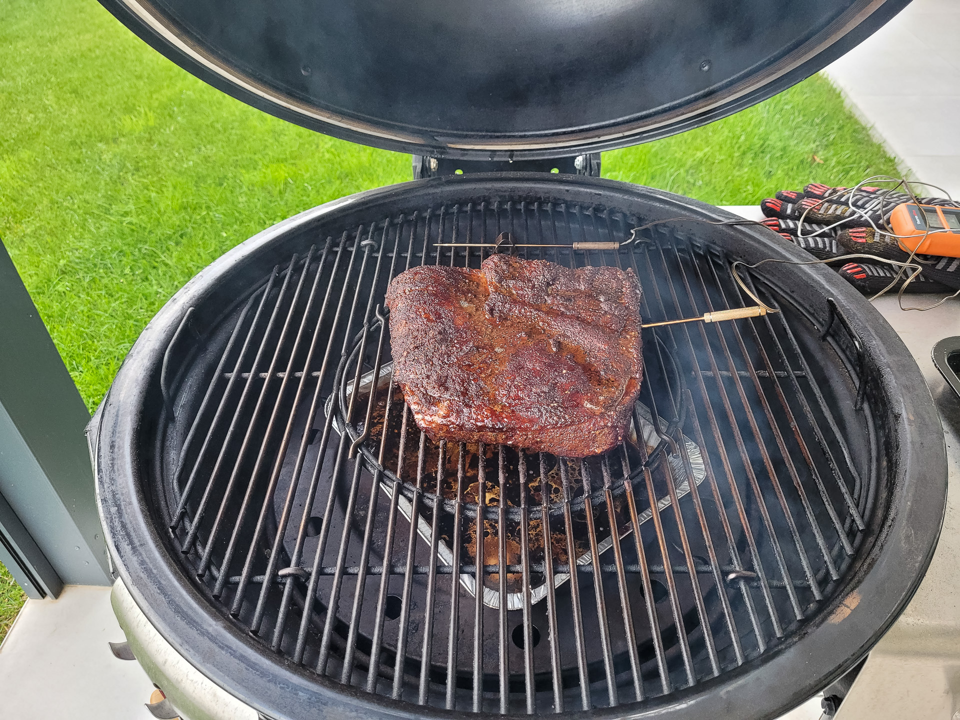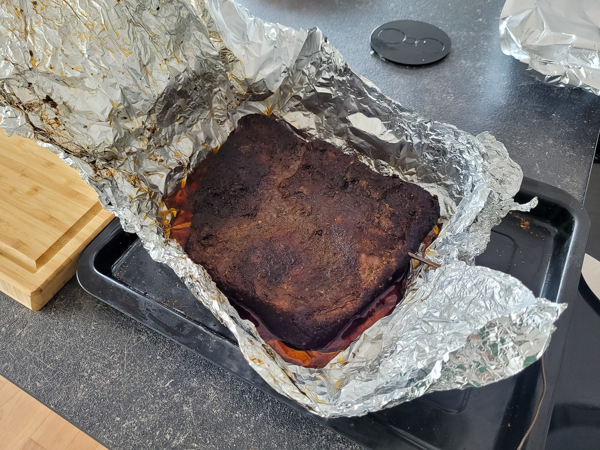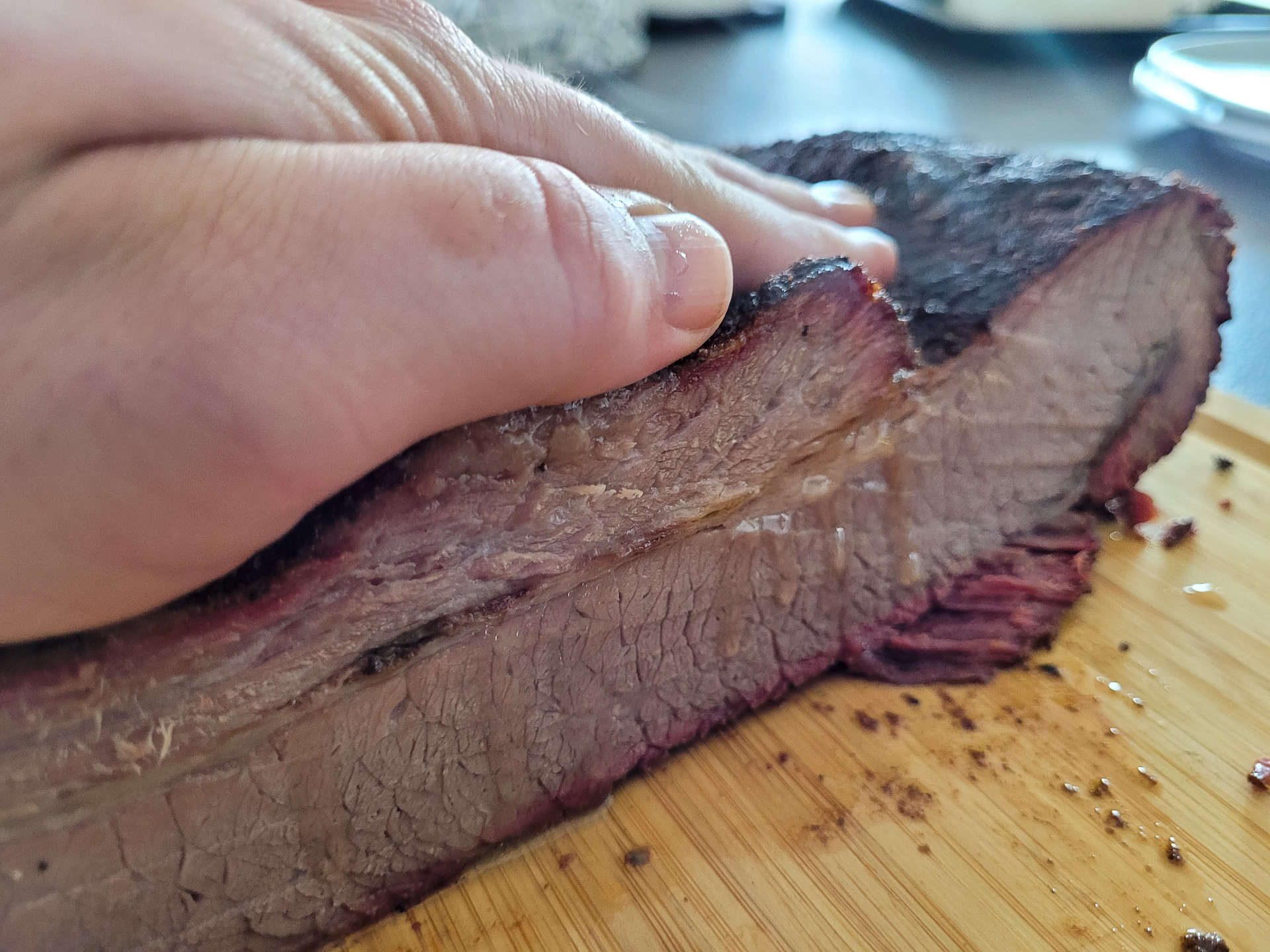 Brisket dimim cca. 8-9h oz dokler ne dosežemo notranje temperature cca. 75°C. Nato ga zavijem v dvojno plast alu folije ter zvišam temperaturo žara na 130°C. Pečem še cca 2-3h oz dokler ne dosežem notranje temperature 95°C. Ali je brisket res narejen, lahko enostavno preverim tako, da ga s temperaturno sondo piknem v različne dele. Sonda mora prodreti skozi meso brez upora.