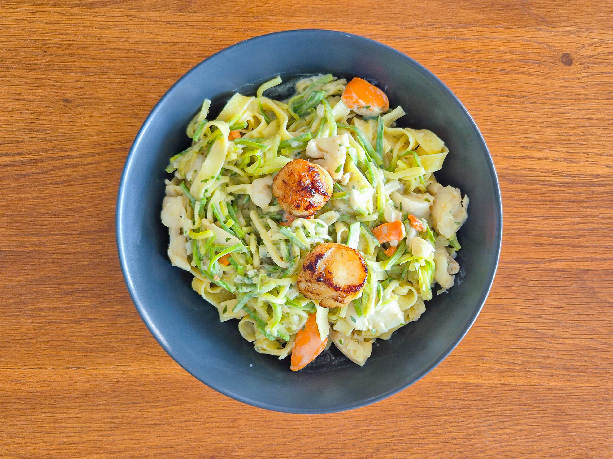 Rezance skuhamo v osoljeni vodi in prihranimo malo vode od kuhanja. Na olivnem olju popražimo drobno sesekljano čebulo in česen, nato dodamo štiri nasekljane kapesante, ki jih na hitro popečemo. Zalijemo z belim vinom in pustimo nekaj minut, da alkohol izhlapi. Dodamo narezane bučke, rahlo posolimo in popopramo, nato prilijemo smetano za kuhanje in po potrebi kanček vode od testenin, da dobimo lepo povezano omako. Vmešamo še sesekljan peteršilj in kuhanim rezancem primešamo omako. Preostale cele kapesante spečemo posebej na maslu in jih na koncu položimo na vrh testenin.