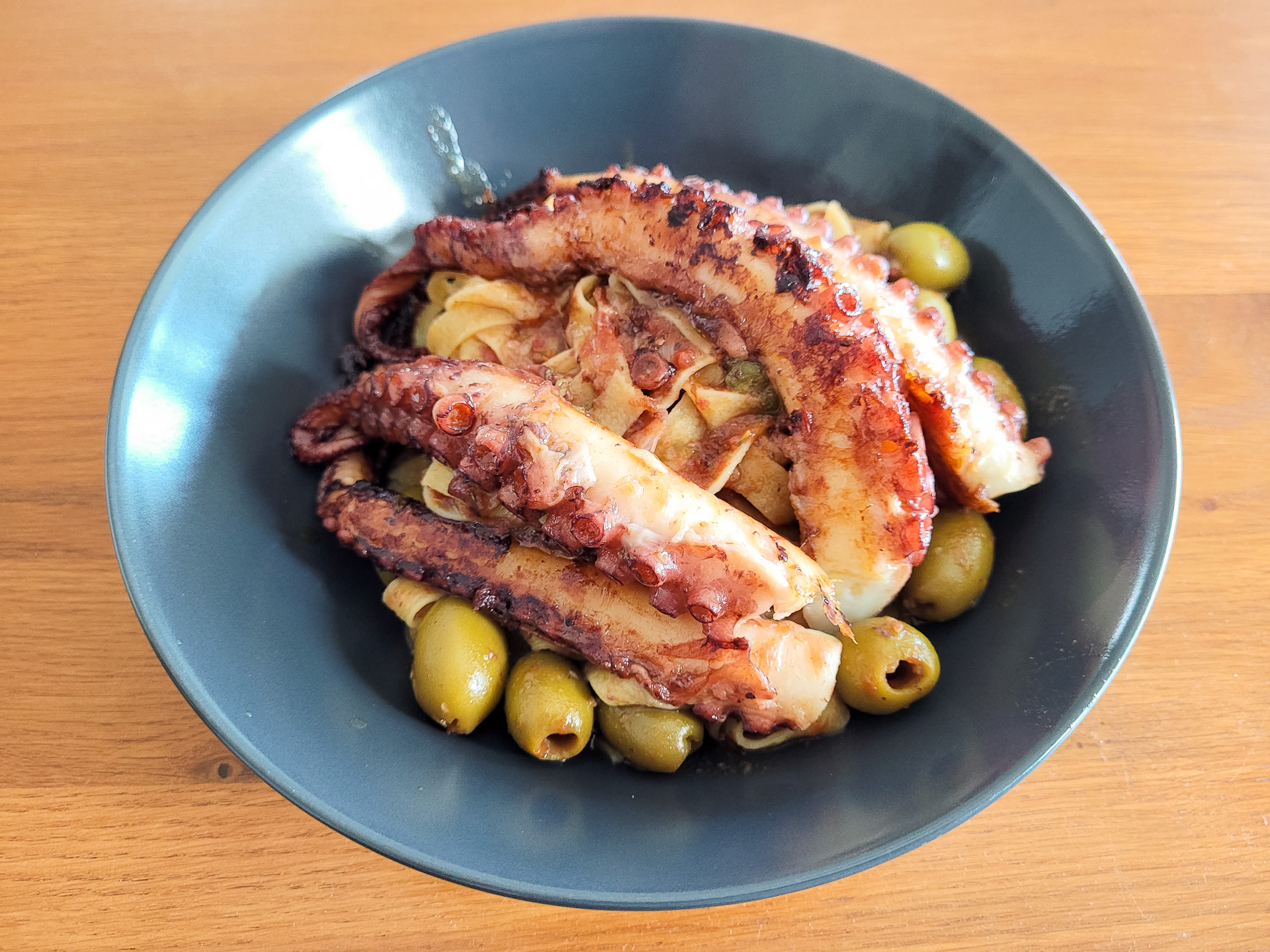 Skuham rezance skoraj do konca. Kuhanje dokončam v omaki, ki jo je spustila hobotnica.