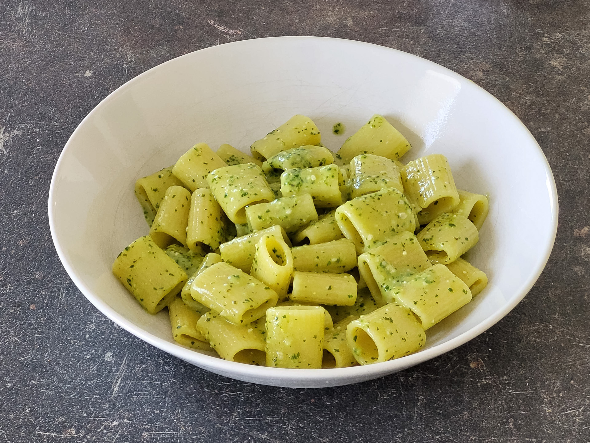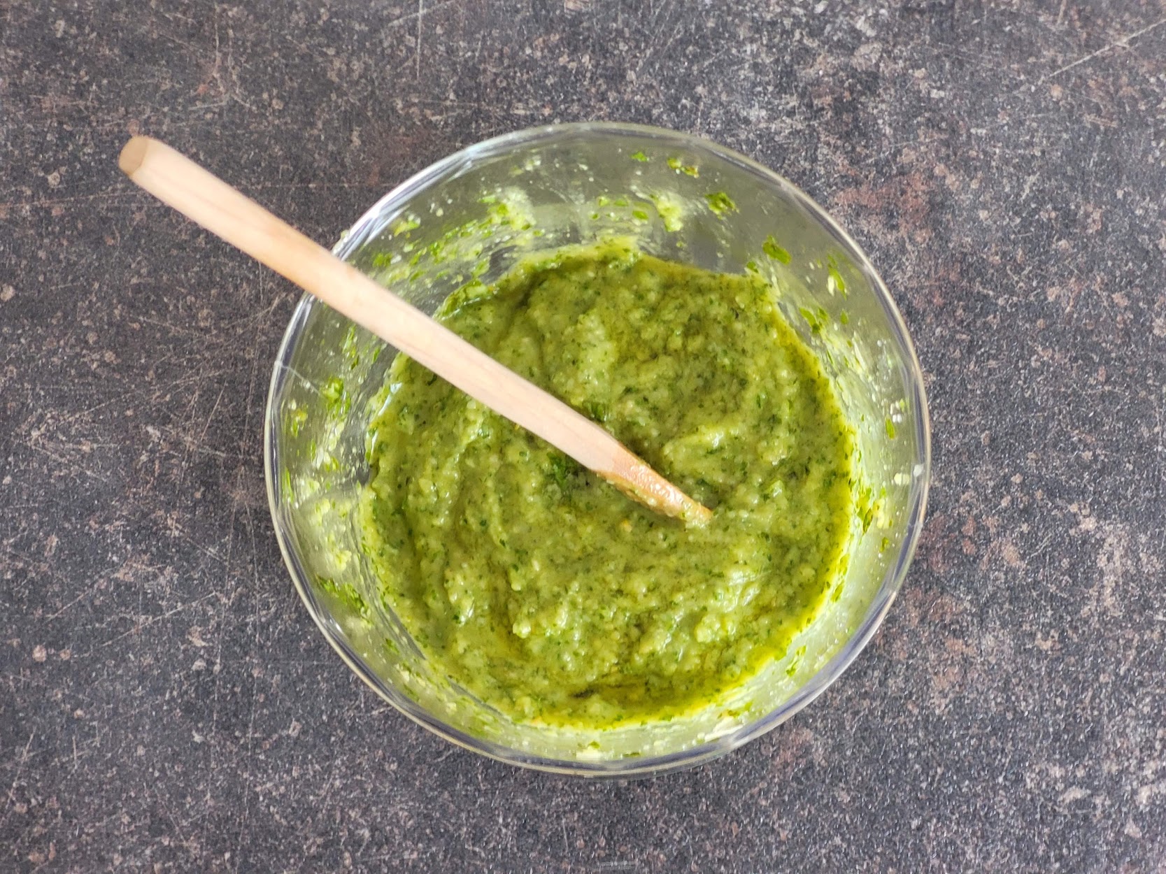 Skuham testenine, zmešam s pripravljenim pestom in malo vode v kateri so se kuhale testenine.