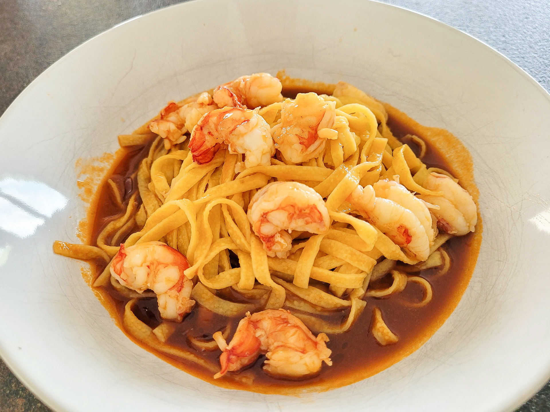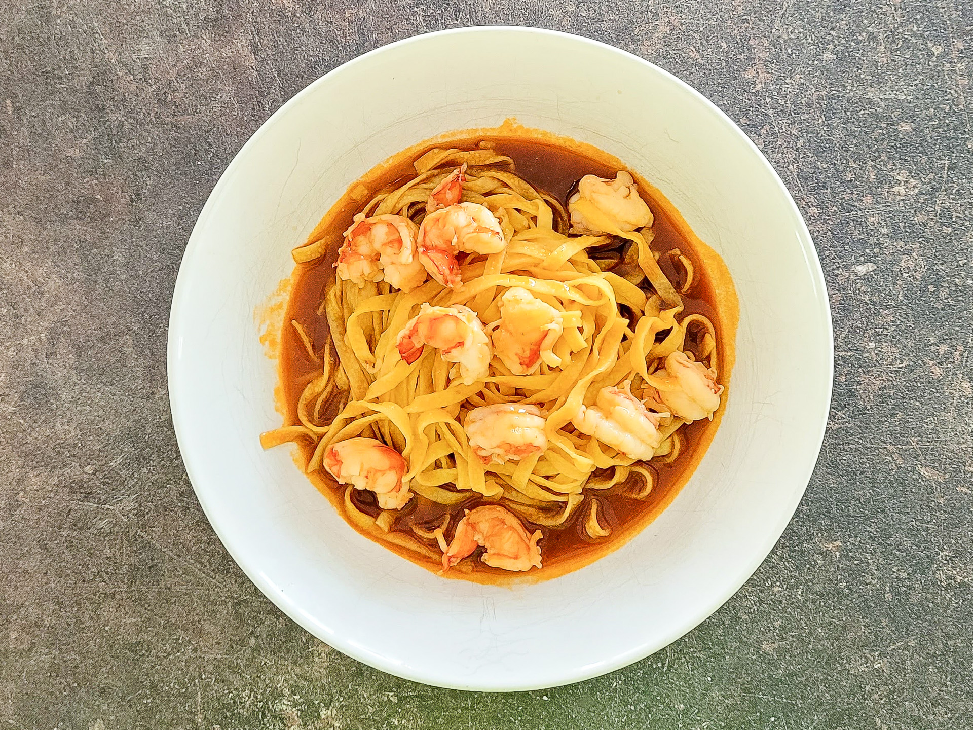 V globok krožnik dam omako, ki ji primešam sojino omako. Na njo položim kuhane rezance ter na vrh še popečene kose rakov. Pokapam z žličko rakovega olja.