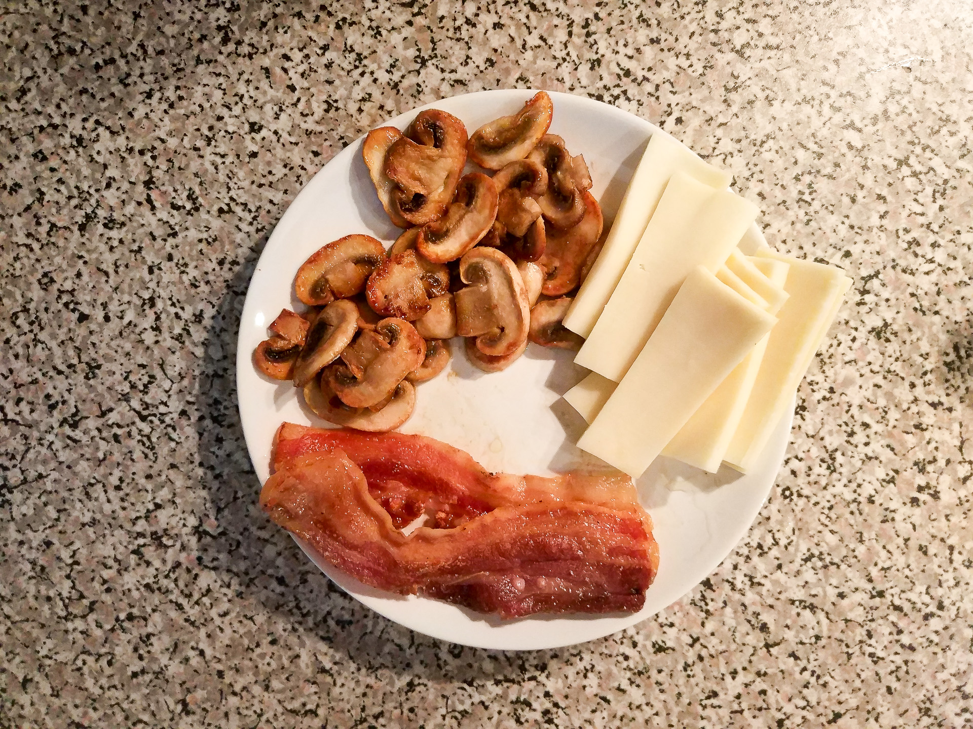 Sir narežem na trake. V 2 rezine kruha naredim luknjo – krogec. Šampinjone narežem na rezine in sotiram. Panceto popečem v ponvi, da rata hrustljava.