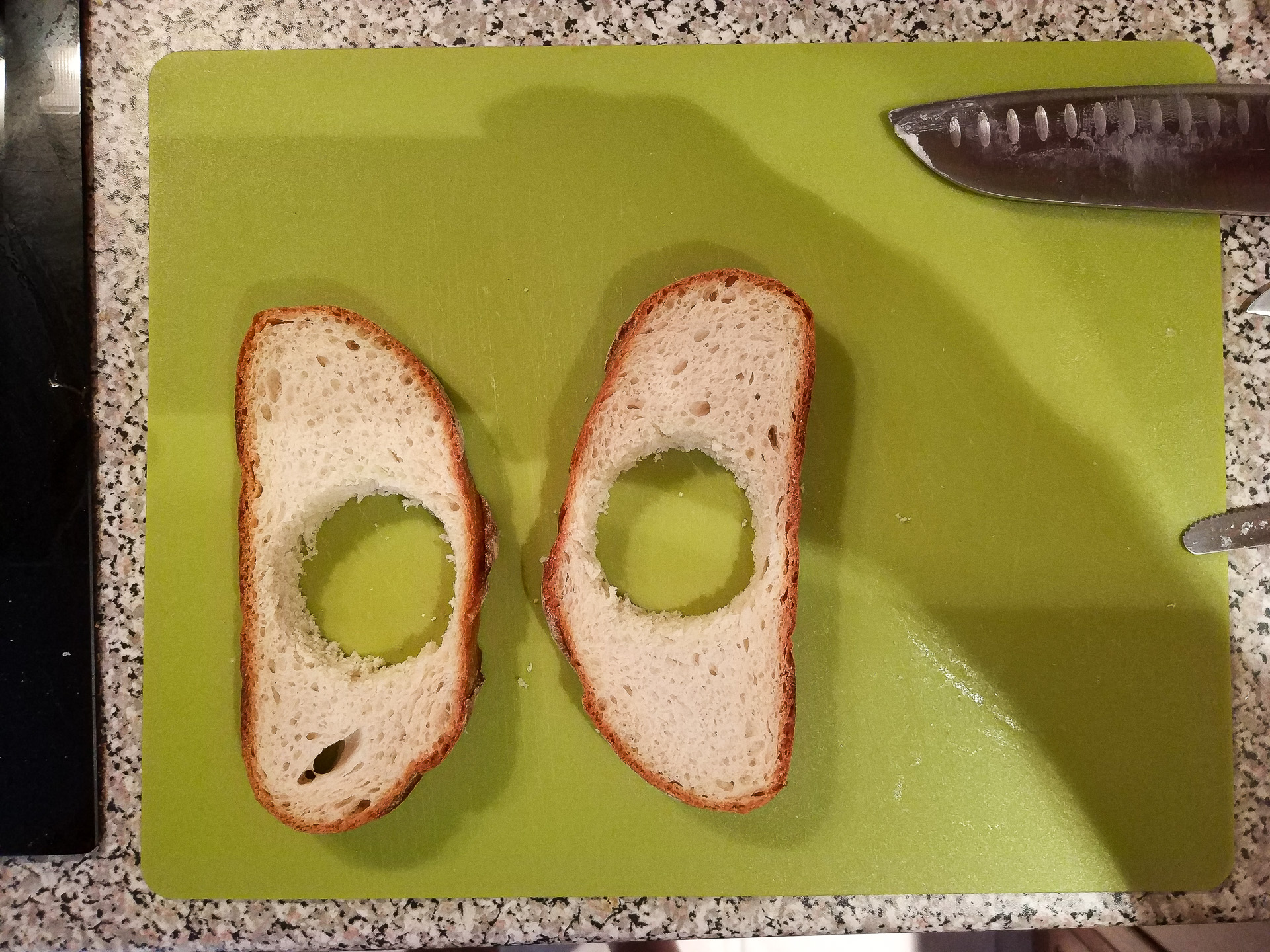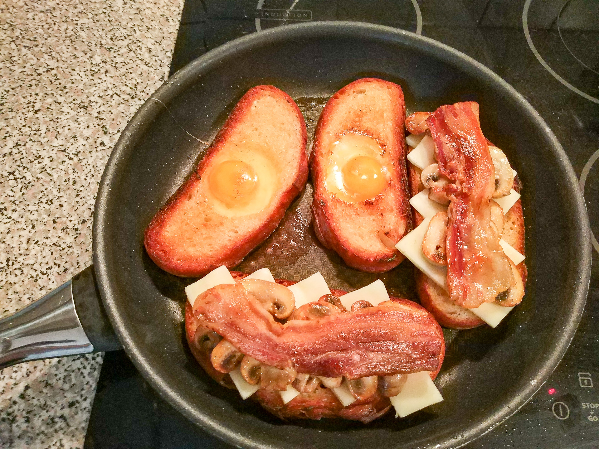 V ponvi kjer sem pekel panceto dodam še malo masla in segrejem na srednjo temperaturo. Na eni strani popečem vse 4 rezine kruha. Ko je ena stran zapečena jih obrnem. V rezini z luknjo vlijem jajčka. Nato ga solim in popram. Preostali rezini obložim s sirom, šampinjoni in panceto. Pokrijem in pečem na srednjem ognju še cca 5 min.